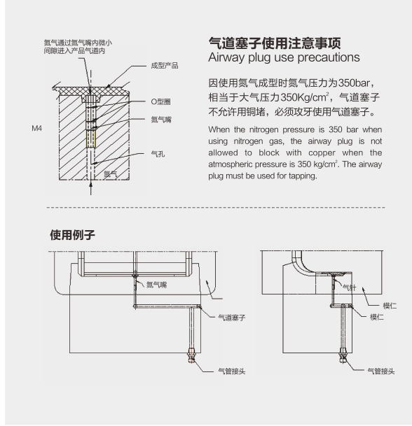 氮气喷嘴在一些大型模具上门需要对模具内部进行冲氮气从而降低模具重量、节省塑胶材料以及让树脂均匀分布到产品前端的时候使用。